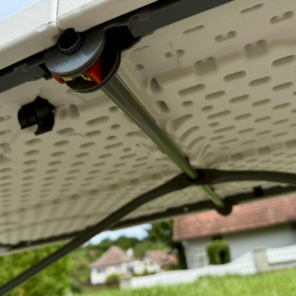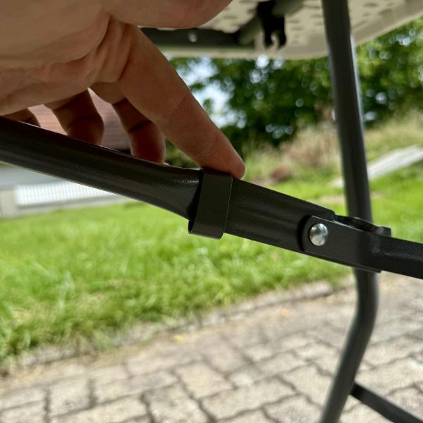 - Piètement pliant tube métallique Ø 28,6 mm encastré sous le plateau en position repliée.